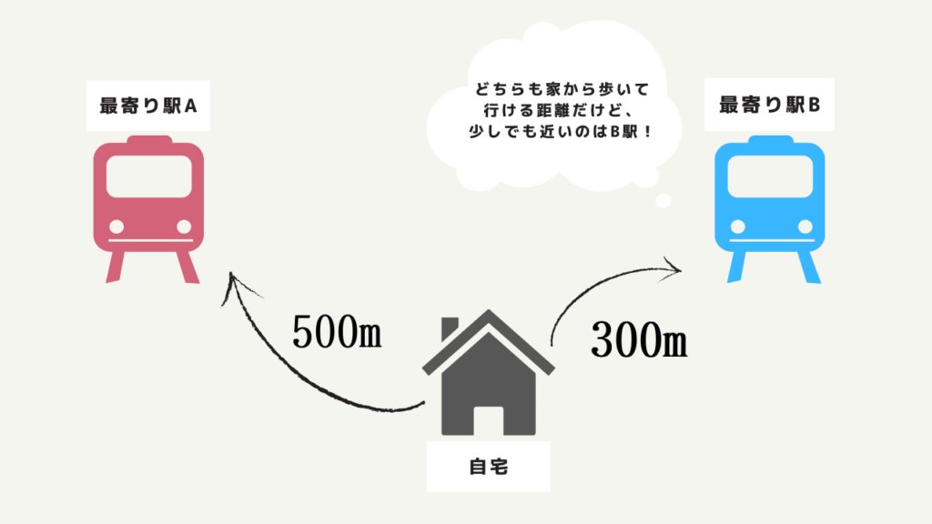 家から歩いて行ける距離に『最寄り駅A』・『最寄り駅B』という駅が2つあり、訓練校へはどちらの駅を使っても行けるとします。